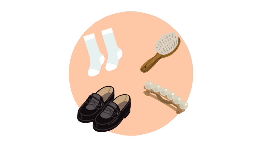 | 靴下 | ・白が最も人気があり、春らしい爽やかな印象を与える。 ・フリルや小さなリボンがついたデザインなら、特別感が増す。 |